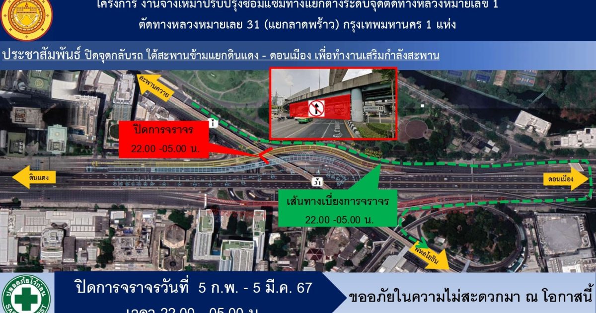 โดยจะทำการปิดถนนใต้สะพานข้ามเเยกดินแดง – ดอนเมือง/พหลโยธิน (สะพานควายมุ่งหน้ารัชโยธินและพหลโยธินไปดอนเมือง) โปรดสังเกตป้ายเตือนและปฏิบัติตามป้ายเเนะนำ เพื่อความปลอดภัยของผู้ใช้รถใช้ถนน