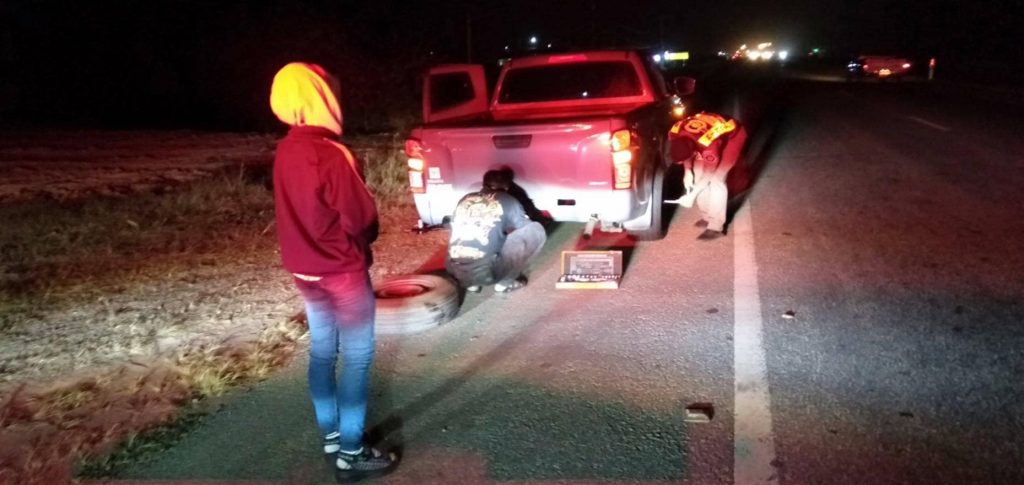 ตำรวจทางหลวงสงขลา,สตูล หน่วยบริการฯ จะนะ วันที่ 12 ก.พ. 67 รถวิทยุ 7301 พร้อมเจ้าหน้าที่ รายชื่อดังต่อไปนี้ ร.ต.ท.อภิชาติ แก่นคำ พลขับ ร.ต.ท.พงศกร บุญรัตน์ พงว. รับแจ้งจาก 1193 มีรถ ว.18 ( ยางแตก ) ณ ทล.43 กม.61 ต.เทพา อ.เทพา จ.สงขลา ผู้ขับขี่ชื่อนาย ธันวา รอเหะ พร้อมกับภรรยา ได้เดินทางมาจากอำเภอหาดใหญ่ จะเดินทางไปจังหวัดนราธิวาส ได้ประสานว่าตนมียางอะไหล่แต่ไม่มีประแจถอดล้อเจ้าหน้าที่ตำรวจทางหลวงจึงได้นำประแจถอดล้อ เพื่อถอดล้อเปลี่ยนยางอะไหล่เพื่อให้ประชาชนเดินทางต่อไปได้อย่างอุ่นใจ ทำทุกอย่างด้วยสำนึกเพราะเราคือตำรวจทางหลวงสงขลา,สตูล