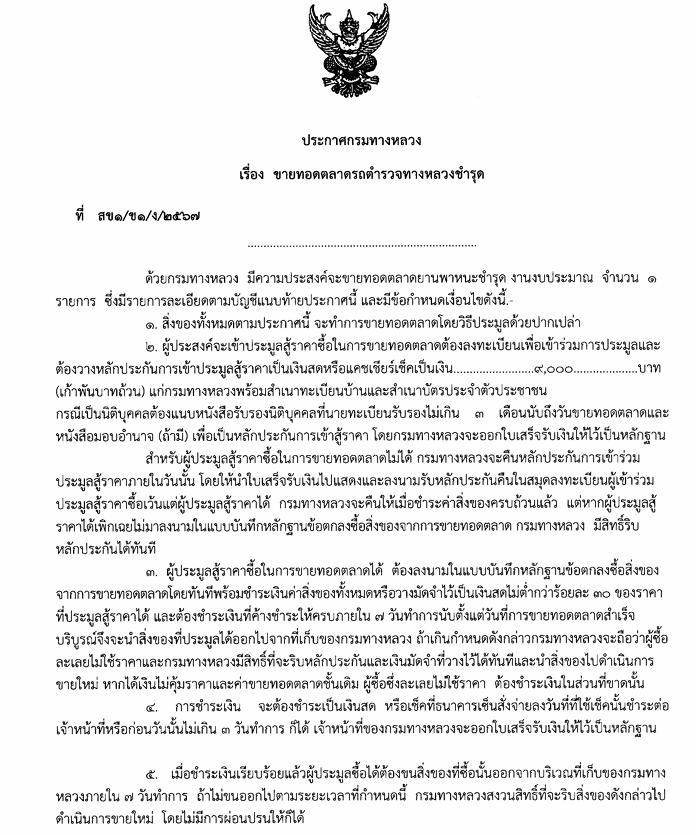 ด้วยแขวงทางหลวงสงขลาที่ 1 มีความประสงค์จะขายทอดตลาดยานพาหนะชำรุด งานงบประมาณ จำนวน 1 รายการ ได้กำหนดขายโดยวิธีประมูลราคาด้วยปากเปล่า ในวันที่ 5 มิถุนายน 2567 ตั้งแต่วันที่ 10:00 น เป็นต้นไป ณ ห้องประชุม ส.ทล.3 กก.7 บก.ทล.
